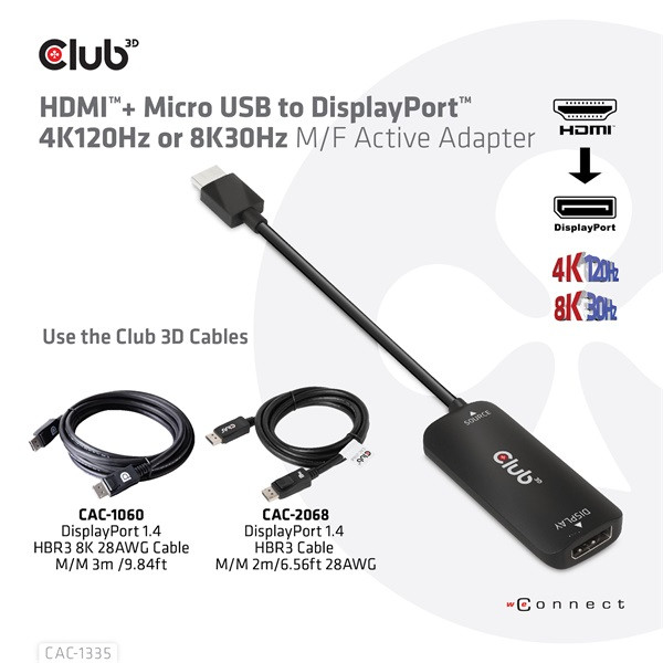 Club 3D Átalakító - CAC-1335 (HDMI+Micro USB to DisplayPort, 4K120Hz/8K30Hz, M/F, aktív)