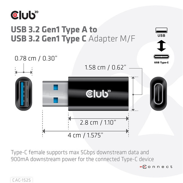 Club 3D Átalakító - CAC-1525 (3.2 USB-A Gen 1 to 3.2 USB-C Gen 1, Bidirectional)
